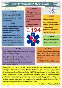 Dana 12.05.2017. u 11:30 sati na adresi Gajevo ul. 2, 10413, Kravarsko, Udruga dispečera hitne medicine (UDHM) u suradnji s Osnovnom školom Slavka Kolara u Kravarskom i uz svesrdnu podršku Hrvatskog zavoda za hitnu medicinu (HZHM) i potporu HZZO-a održat će u prostorijama škole javno zdravstvenu akciju „Šest pitanja koja život znače“. Trajanje akcije predviđeno je do 12:30 sati.